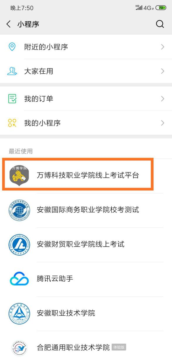 打开手机微信,在“微信”页面中下拉出现小程序查找页面或在“发现”页面的小程序菜单上,在搜索框中输入“万博科技职业学院线上考试平台”进行查询,在查询结果中点击“万博科技职业学院线上考试平台”小程序即可打开登录页面,或者直接使用微信扫一扫识别二维码进入小程序;