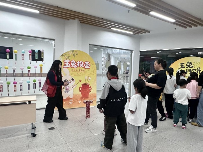 猜灯谜区域同样热闹非凡,五彩灯笼下悬挂着妙趣横生的谜题。志愿者们与社区小朋友一起开动脑筋,踊跃竞猜,不时传来阵阵欢呼,欢声笑语不绝于耳。“玉兔钓月饼”游戏也深受孩子们喜爱,他们手执钓竿,专注投入,在游戏中进一步加深了对中秋文化的认知。