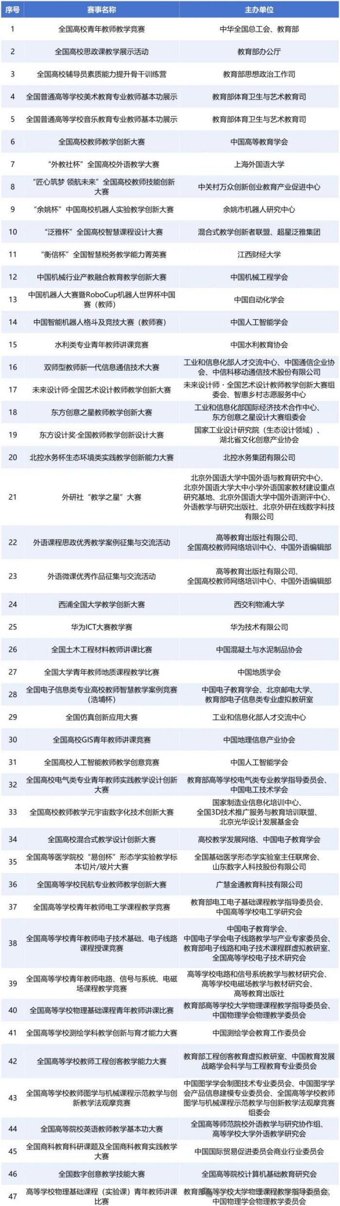 根据专家组于2025年11月10日发布的高校教师教学竞赛征集通知,经竞赛主办方自愿申报、形式审查、初评及专家委员会审议等环节,共遴选出47项赛事纳入2025年全国普通高校教师教学竞赛研究(详见下图)。分析报告采集了上述赛事自2012年至2025年共14年的数据,对高校教师教学竞赛现状进行了系统分析与研究。