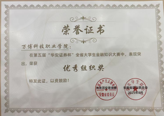 我校荣获第五届“华安证券杯”全省大学生金融知识大赛“优秀组织奖”近日,团省委、省学联联合华安证券股份有限公司共同举办的第五届“华安证券杯”安徽省大学生金融知识大赛顺利落下帷幕。本届大赛自